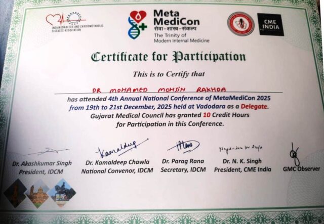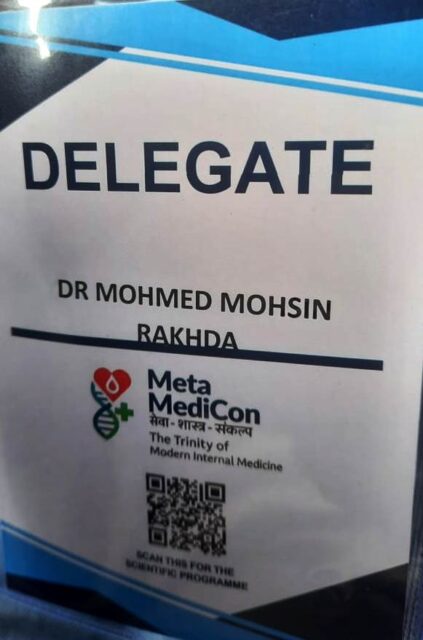 One of our Tankarvi Dr. Mohmedmohsin Mustak Rakhda has attended 4th Annual National conference of MetaMedicon 2025 from 19th December to 21st December 2025 held at Vadodara as a DELEGATE. Gujarat Medical council has granted 10 Credit hours for participation in this conference. In that Dr. Mohmedmohsin Rakhda is one of delegate.